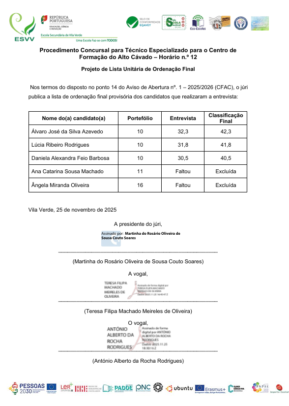 Procedimento Concursal para Técnico Especializado para o Centro de Formação do Alto Cávado - Horário n.º 12
